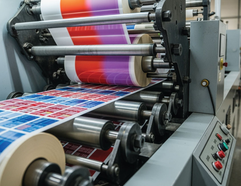 Modern sticker printing technology including digital cut stickers, variable data labels, and electronic sticker design services.