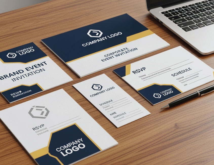 Professional business event invitations including conferences, seminars, product launches, and company celebrations with branded designs.